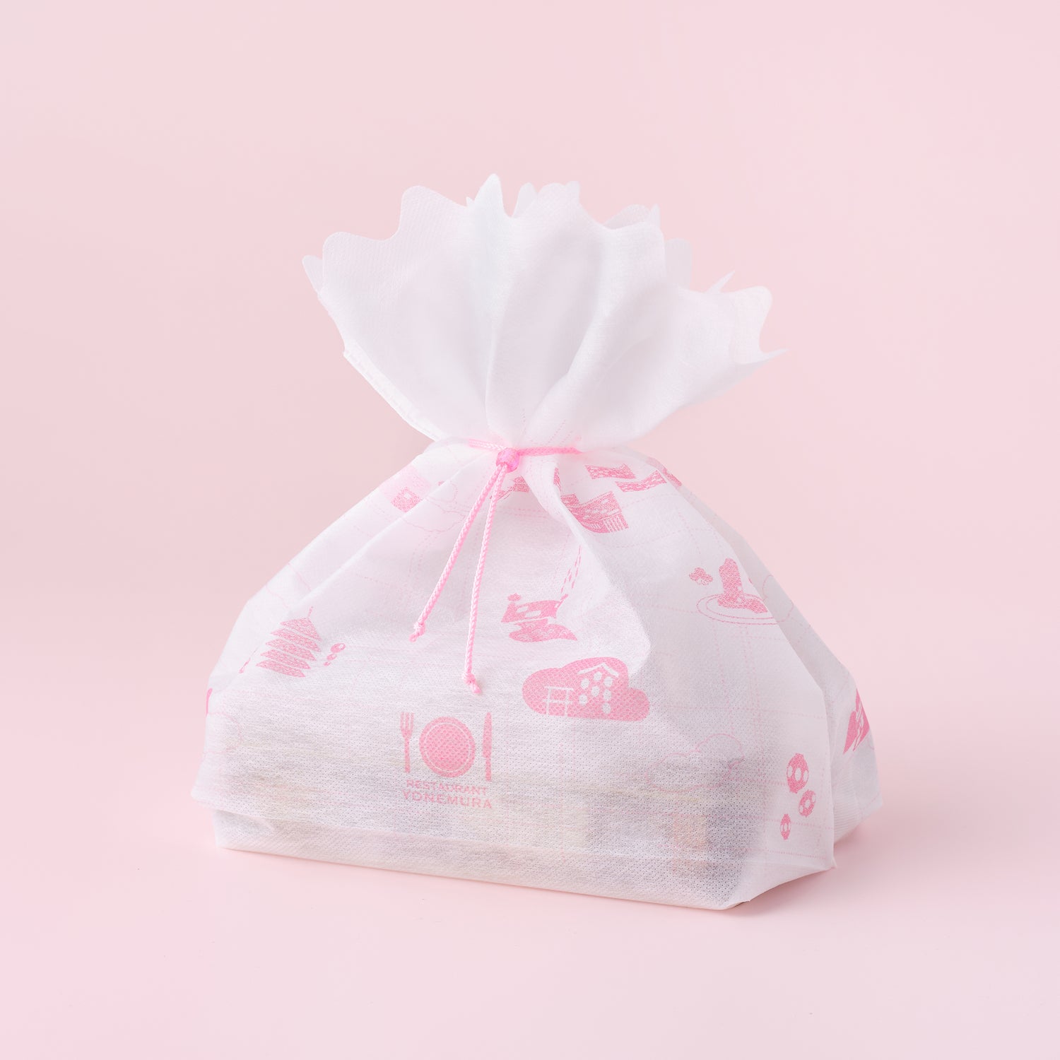 ご贈答用にご好評をいただいております「よねむらオリジナルクッキー」専用の巾着袋。京都の名所をイメージしたイラストを施した、贈るキモチまでていねいに包みこむ、やさしい雰囲気のデザインです。